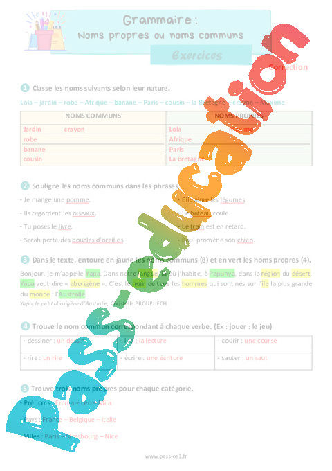 Correction Exercices Les noms communs et noms propres : 2eme Primaire pdf