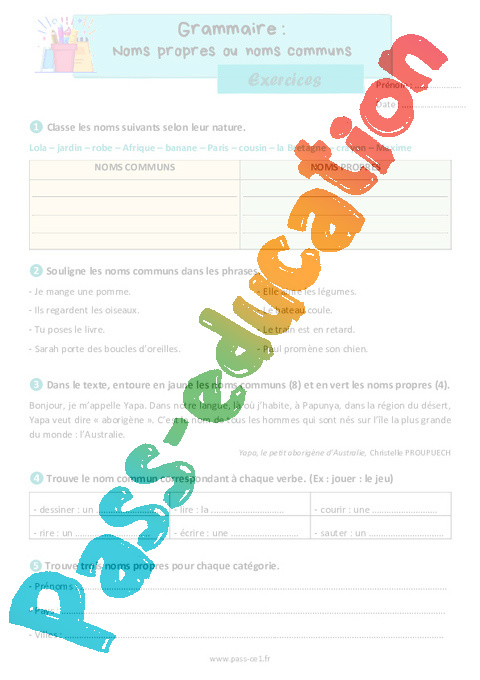 Exercices Les noms communs et noms propres : 2eme Primaire rtf