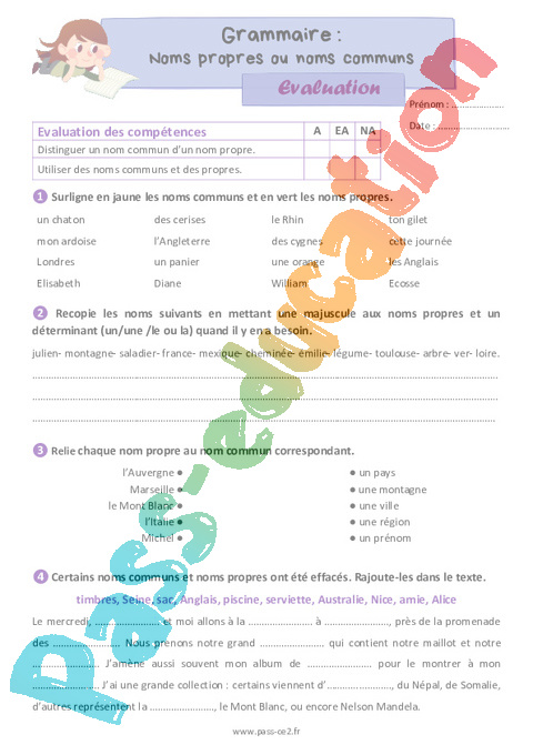Correction Evaluation : 3eme Primaire Noms propres ou noms communs pdf