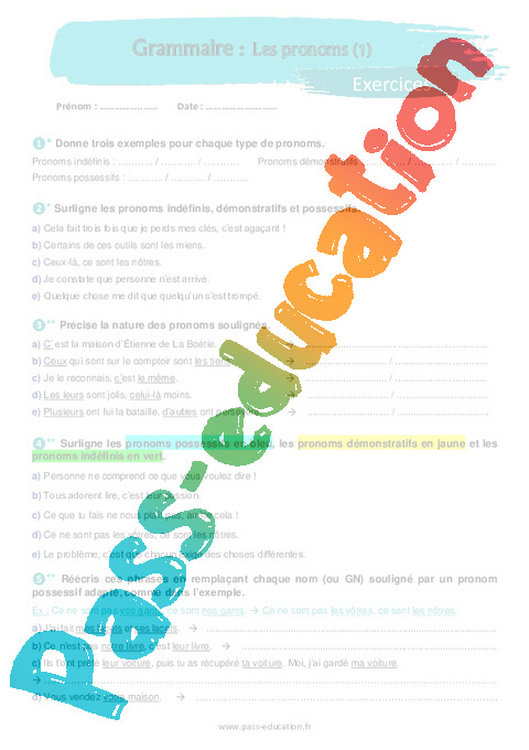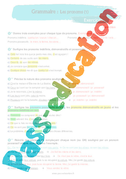 Surligne les pronoms possessifs en bleu, les pronoms démonstratifs en jaune et les pronoms indéfinis en vert.