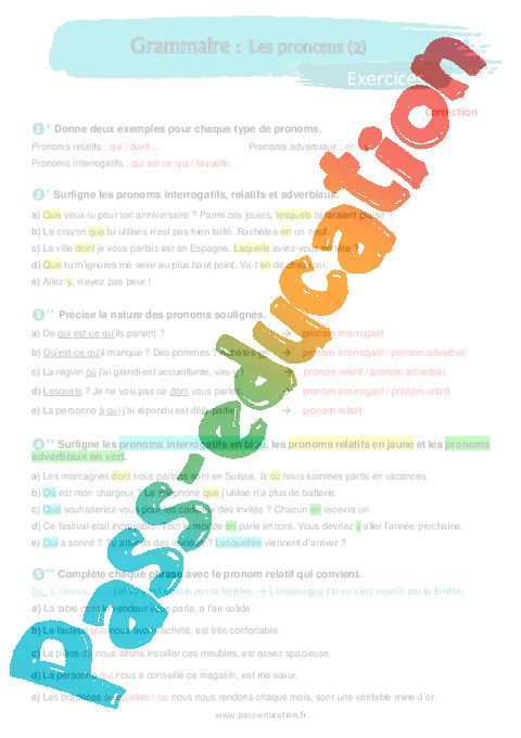 Surligne les pronoms interrogatifs en bleu, les pronoms relatifs en jaune et les pronoms adverbiaux en vert.