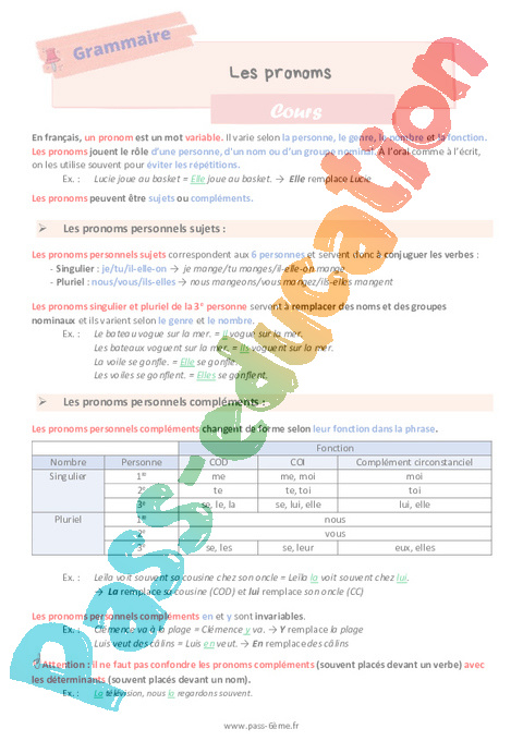 Cours de grammaire sur les pronoms en 6ème.