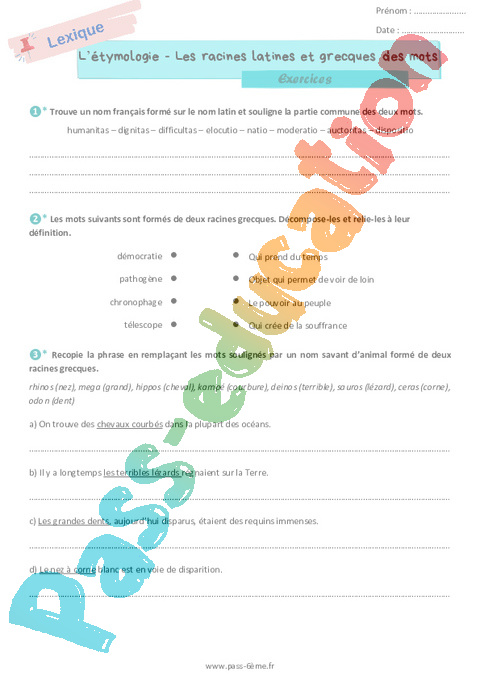 Les racines latines et grecques en français – Exercices de vocabulaire 6ème rtf