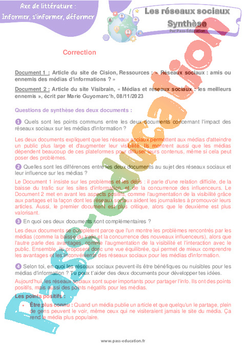 Correction Synthèse Littérature : 2eme Secondaire Les réseaux sociaux pdf