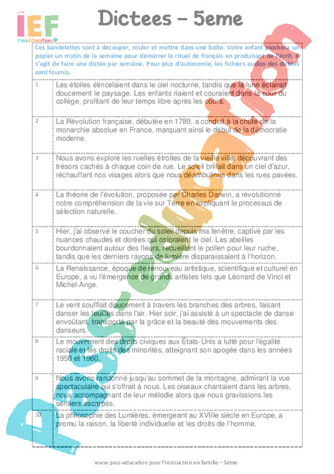 Dictées IEF – école à la maison : 1ere Secondaire pdf