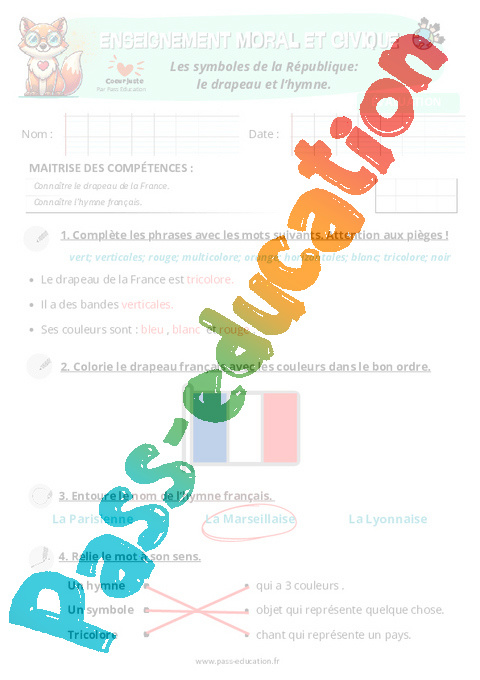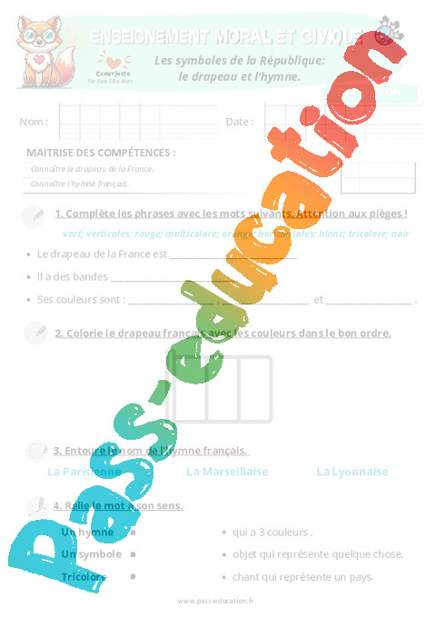 Évaluation à imprimer Les symboles de la République: le drapeau et l’hymne : 1ere Primaire – EMC Education morale et civique.
