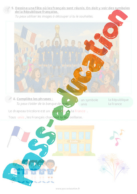 Dessine une fête où les français sont réunis. On doit y voir des symboles de la République française.