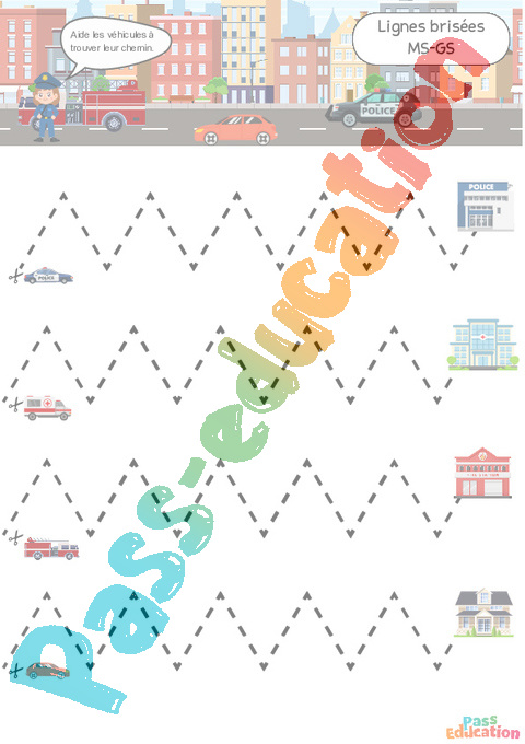 Les véhicules – Lignes brisées – S’entraîner à découper pour mieux maîtriser le geste graphique, un premier pas vers l’écriture en : 2eme, 3eme Maternelle .