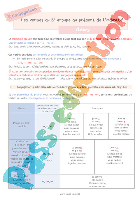 Cours Les verbes du 3ème groupe au présent de l’indicatif 6ème pdf