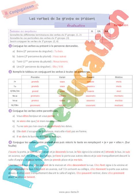 Correction évaluation Les verbes du 3ème groupe au présent de l’indicatif 6ème pdf