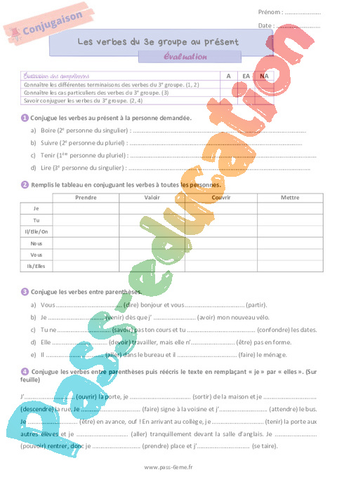 Evaluation Les verbes du 3ème groupe au présent de l’indicatif 6ème pdf