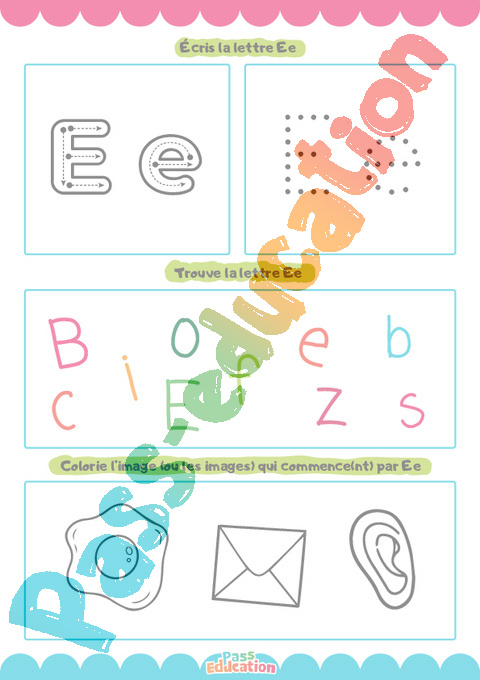 Une activité ludique pour apprendre à écrire la lettre E en majuscule et minuscule, reconnaître sa forme et la repérer dans un mot. Les enfants termineront en coloriant une image qui commence par E, pour renforcer l’apprentissage par le jeu.