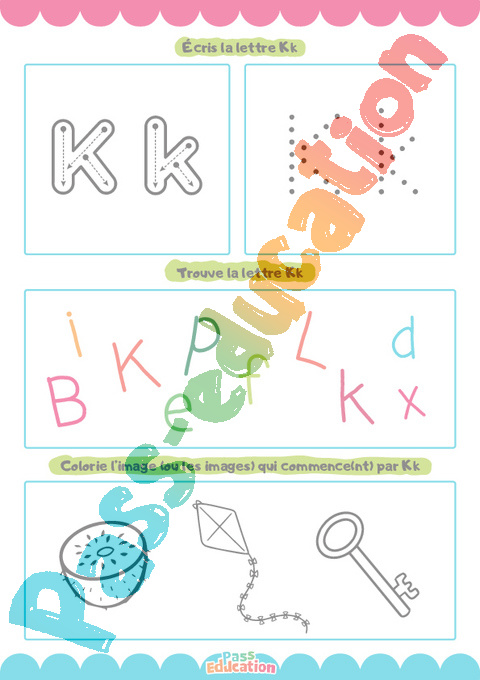 Une activité ludique pour apprendre à écrire la lettre K en majuscule et minuscule, reconnaître sa forme et la repérer dans un mot. Les enfants termineront en coloriant une image qui commence par K, pour renforcer l’apprentissage par le jeu.