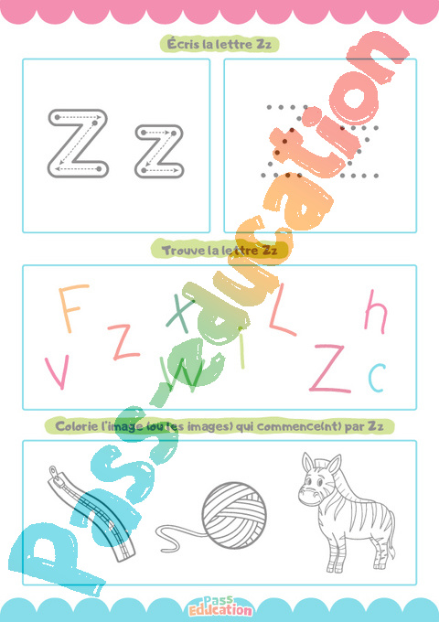 Une activité ludique pour apprendre à écrire la lettre Z en majuscule et minuscule, reconnaître sa forme et la repérer dans un mot. Les enfants termineront en coloriant une image qui commence par Z, pour renforcer l’apprentissage par le jeu.