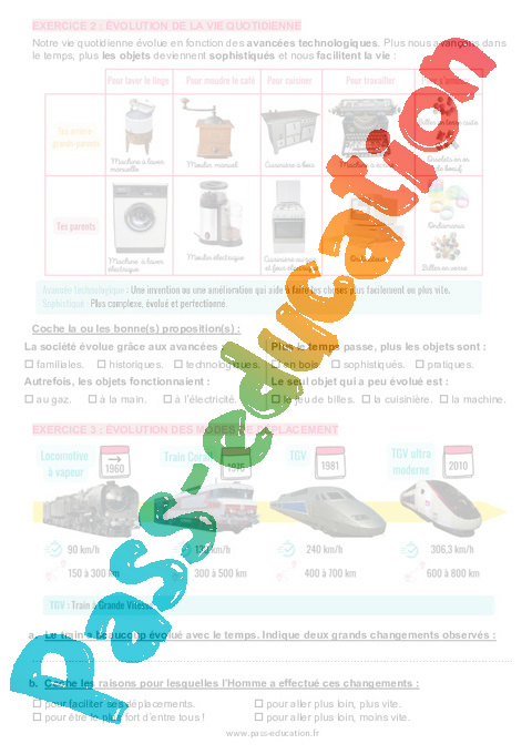 | La société évolue grâce aux avancées : o familiales. o historiques. o technologiques. | Plus le temps passe, plus les objets sont : o en bois. o sophistiqués. o pratiques. |
