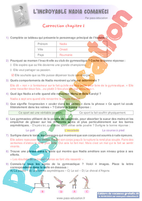Correction Questionnaire : 4eme, 5eme, 6eme Primaire Chapitre 1 L’incroyable Nadia Comaneci pdf
