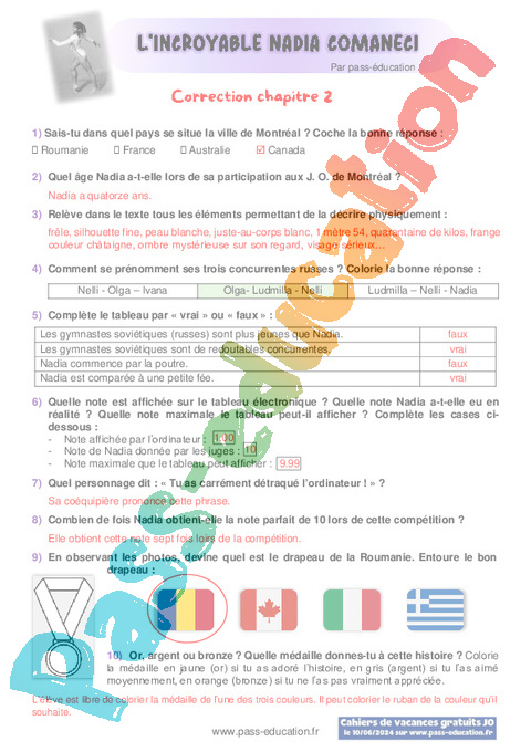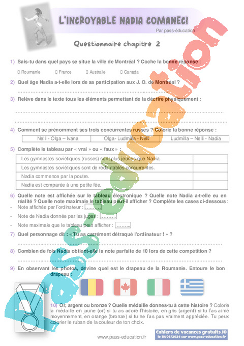 Correction Questionnaire : 4eme, 5eme, 6eme Primaire Chapitre 2 L’incroyable Nadia Comaneci rtf