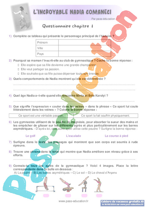 Questionnaire : 4eme, 5eme, 6eme Primaire Chapitre 1 L’incroyable Nadia Comaneci pdf