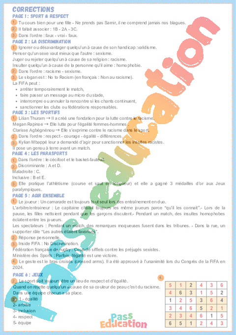 Correction Lutte contre la discrimination et le racisme dans le sport : 4eme, 5eme Primaire pdf