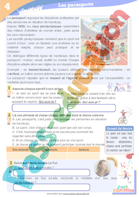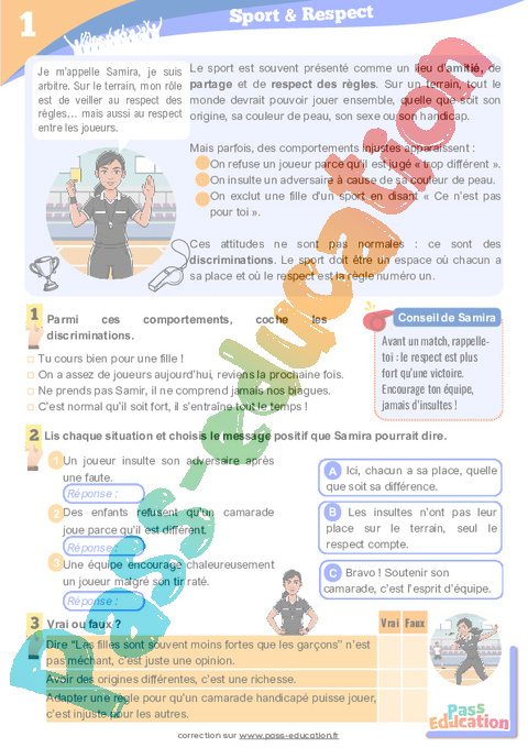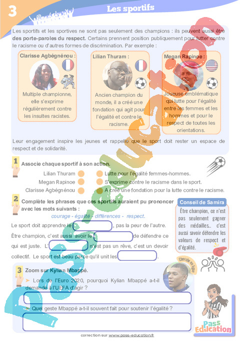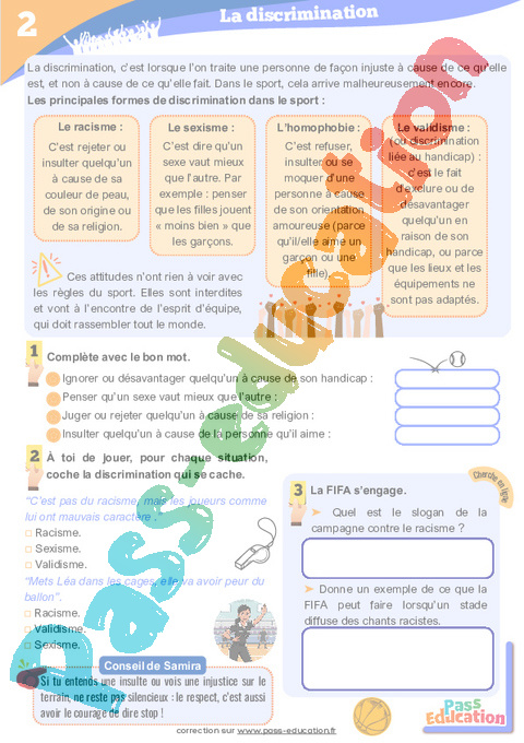 Fichier d’activités à imprimer sur la lutte contre la discrimination et le racisme dans le sport (EMC) pour la 4eme, 5eme Primaire .