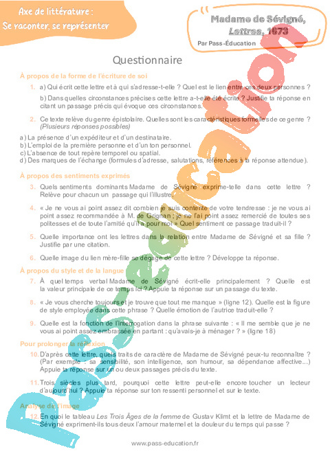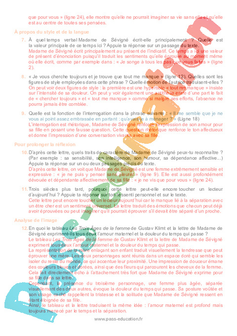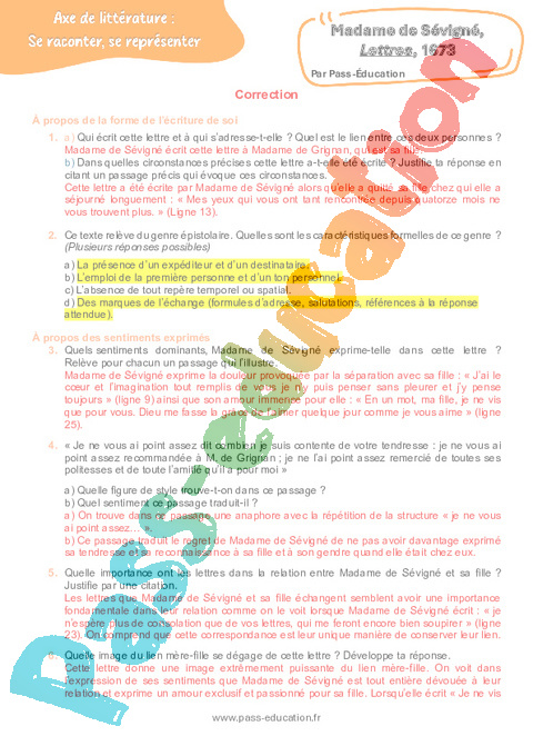 Correction Questionnaire Mme de Sévigné, Lettres, 1673 : 3eme Secondaire pdf
