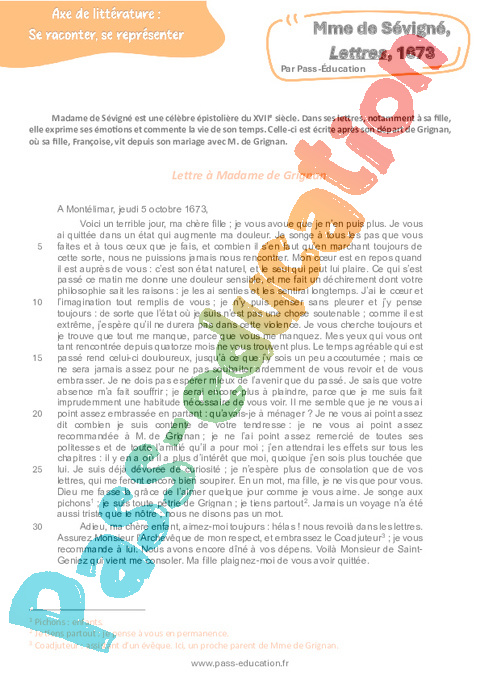 Littérature Mme de Sévigné, Lettres, 1673 : 3eme Secondaire pdf