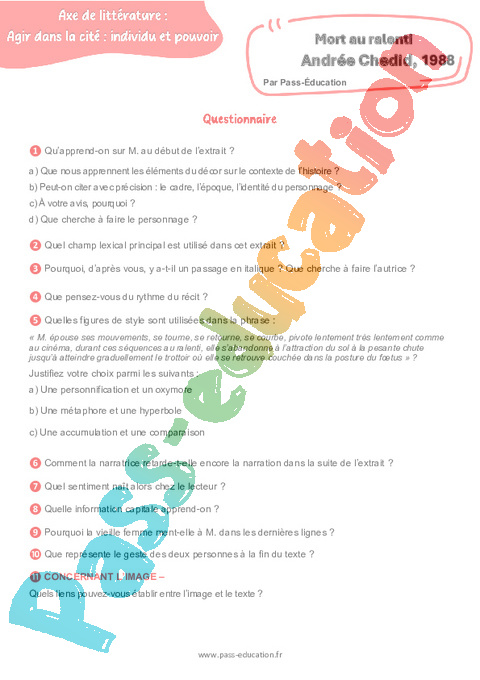 Questionnaire Mort au ralenti (Andrée Chedid) : 3eme Secondaire pdf