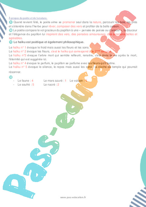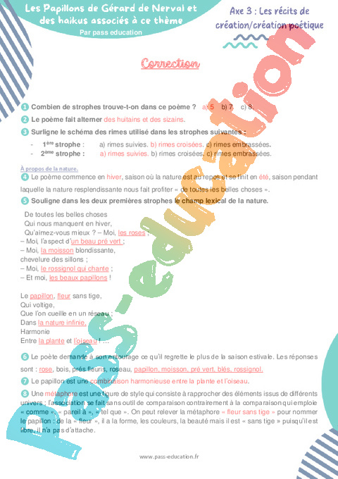 Correction Questionnaire Nature et poésie (sur les papillons) : 6eme Primaire pdf