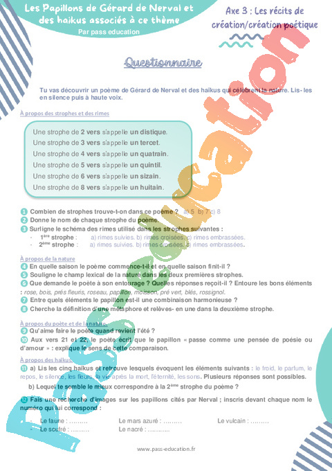 Questionnaire Nature et poésie (sur les papillons) : 6eme Primaire pdf