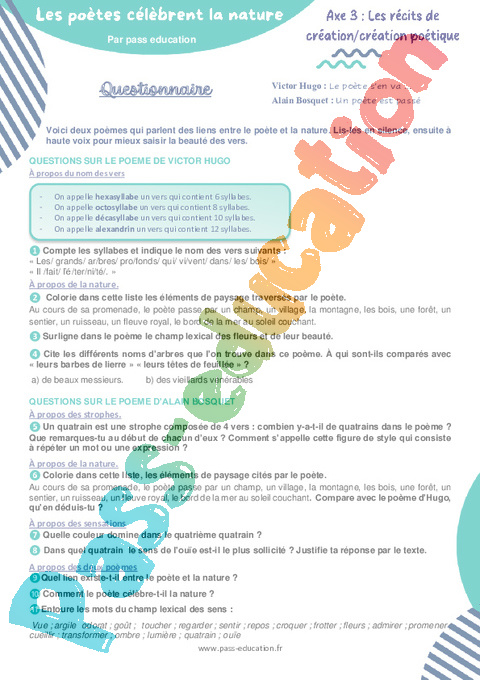 Questionnaire Nature et poésie : 6eme Primaire pdf