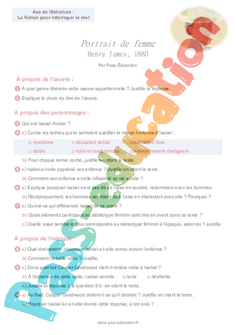 Questionnaire Portrait de femme (Henry James) : 2eme Secondaire pdf