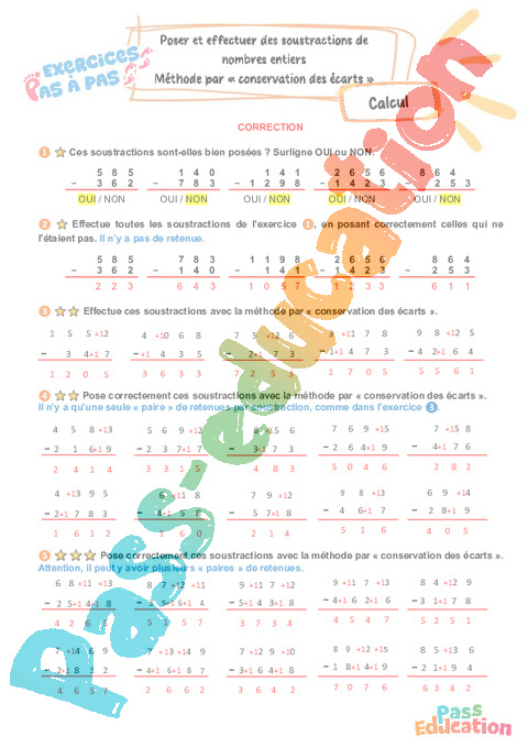 ❺ ⭐⭐⭐ Pose correctement ces soustractions avec la méthode par « conservation des écarts ». Attention, il peut y avoir plusieurs « paires » de retenues.