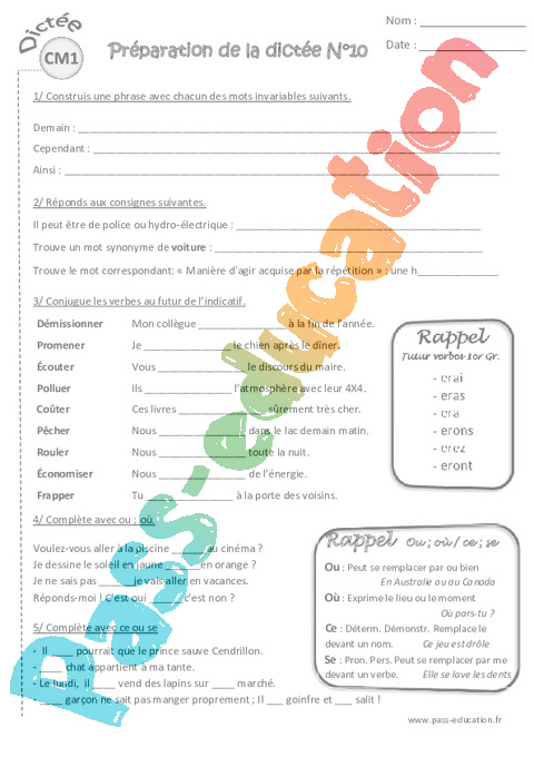 | un véhicule – un barrage – une habitude | Demain – cependant – ainsi | Verbes du 1er groupe au futur | Homophones : ou, où / ce, se |