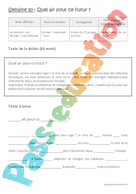 Quel air pour ce futur – Dictée préparée 10 – A trous : 4eme Primaire pdf