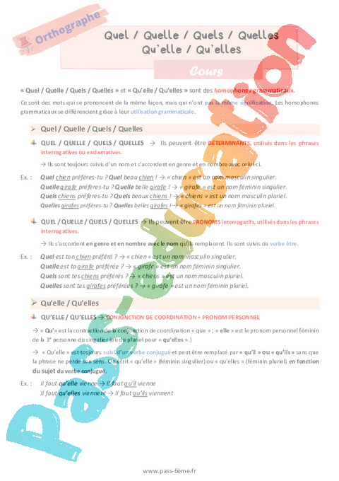 Cours Quel Quelle Quels Quelles Qu’elle (Homophones grammaticaux) 6ème pdf