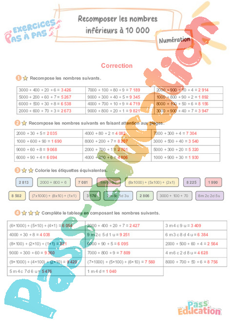 Correction Recomposer les nombres inférieurs à 10 000 : 3eme Primaire – Exercices Pas à Pas rtf