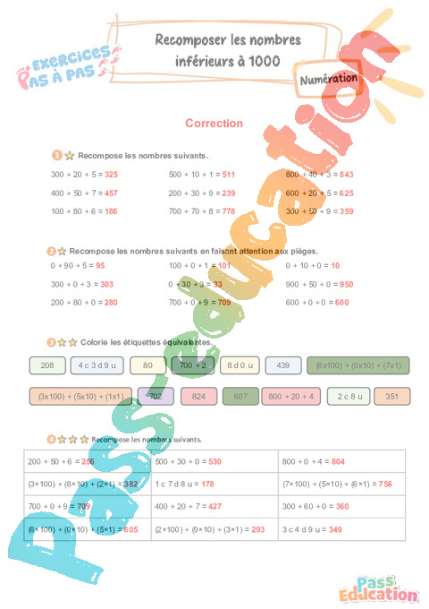 Correction Recomposer les nombres inférieurs à 1000 : 3eme Primaire – Exercices Pas à Pas pdf