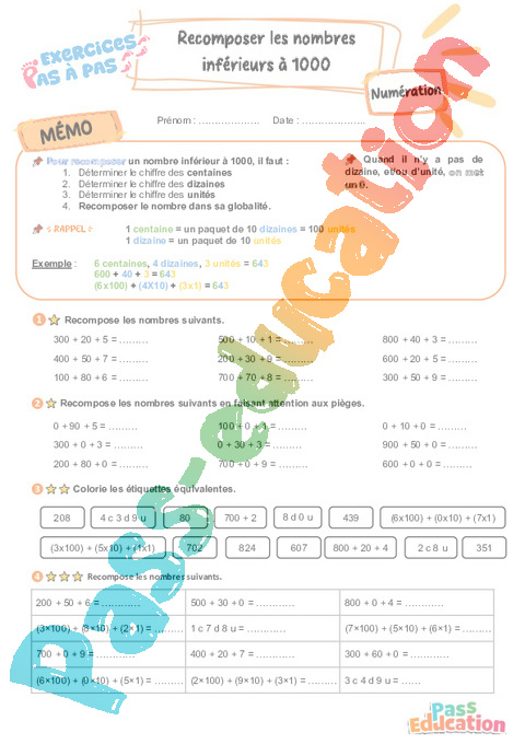 Exercices Pas à Pas avec mémo / leçon de numération pour travailler la compétence : Recomposer les nombres inférieurs à 1000 au : 3eme Primaire .