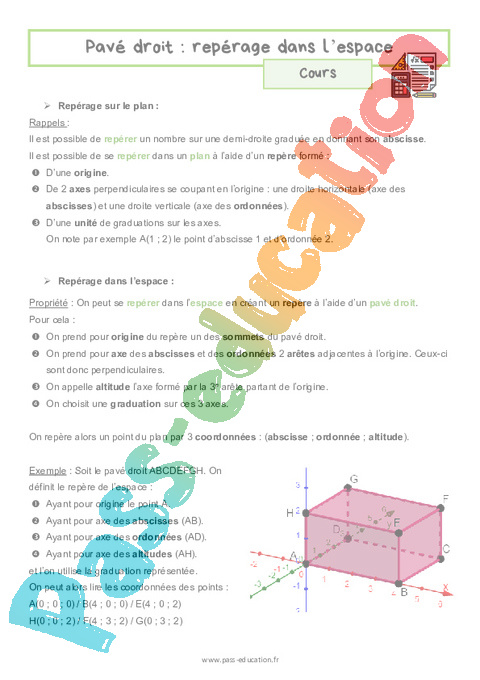 Cours : 2eme Secondaire Repérage dans l’espace – Pavé droit pdf