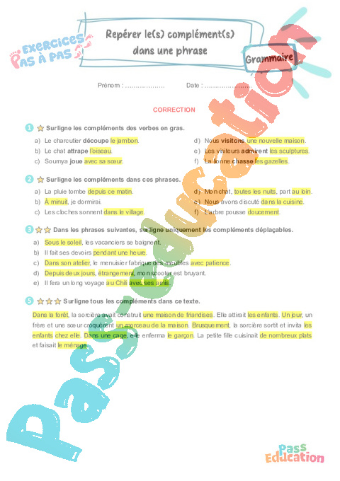 Correction Repérer le(s) complément(s) dans une phrase : 3eme Primaire – Mémo + Exercices Pas à Pas rtf