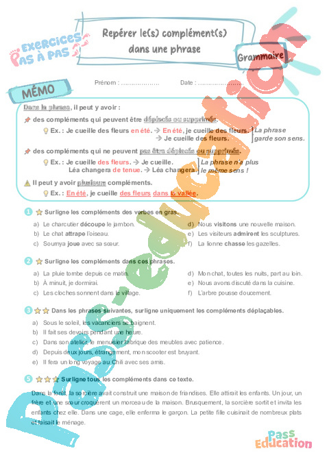 Repérer le(s) complément(s) dans une phrase : 3eme Primaire – Mémo + Exercices Pas à Pas pdf
