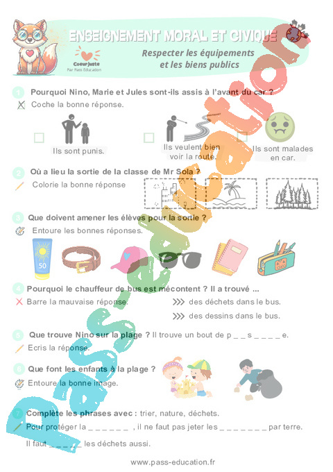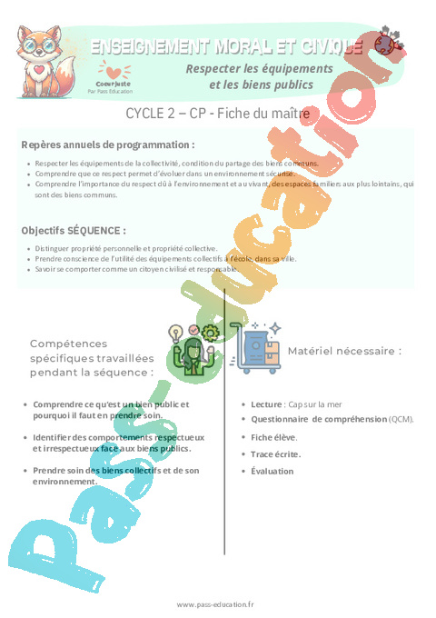 Fiche de préparation sur respecter les équipements et les biens publics : 1ere Primaire – EMC Education morale et civique.