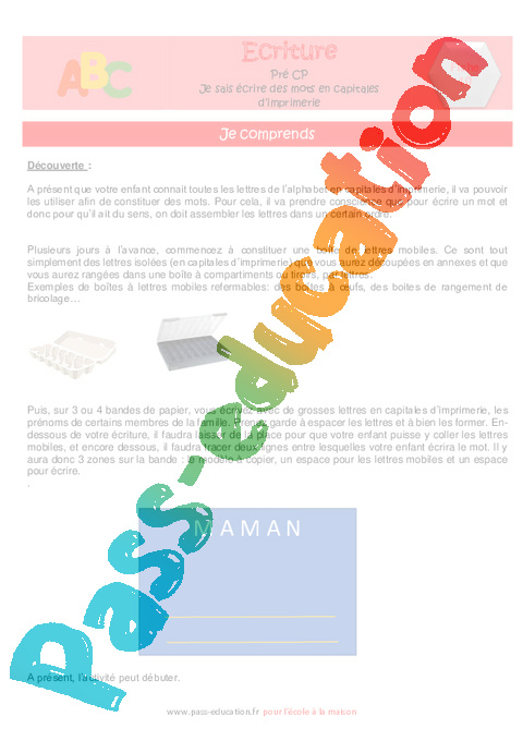Graphisme / écriture : Votre enfant pourra apprendre à écrire quelques mots simples en capitales d’imprimerie : prendre conscience de l’ordre des lettres pour constituer un mot.