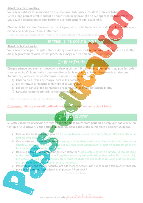 Fonctionnement : La notice pour les parents est à lire sur ordinateur, vous trouverez la mention “imprimer” pour les fichiers enfants dans le nom du dossier lorsque nécessaire. Nous avons limité au maximum le nombre de fiches à imprimer. Vous aurez seulement 10 fiches à imprimer pour cette [semaine 5]. Tous les autres exercices et phases de découverte se feront avec des objets de la maison, ou à l’oral.