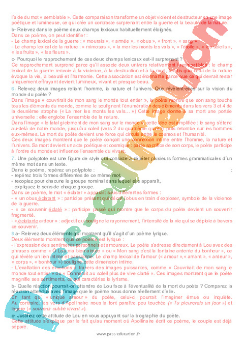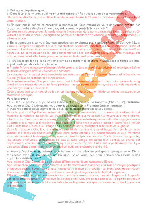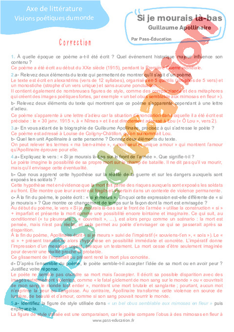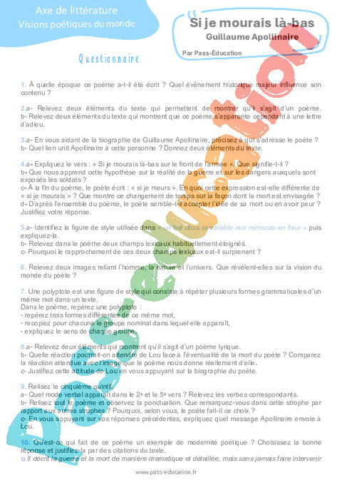 Correction Questionnaire Si je mourais là-bas (G. Apollinaire) : 3eme Secondaire pdf