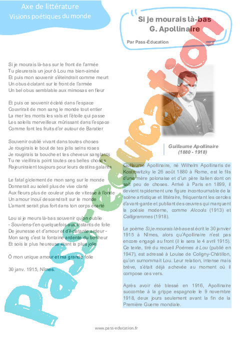 Littérature Si je mourais là-bas (G. Apollinaire) : 3eme Secondaire rtf