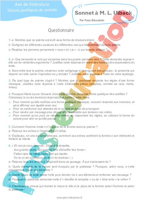 Questionnaire Sonnet à M. L. Ulback : 3eme Secondaire pdf
