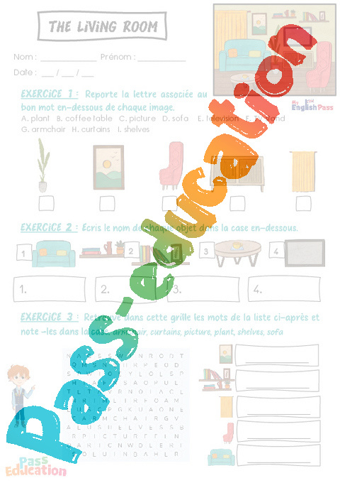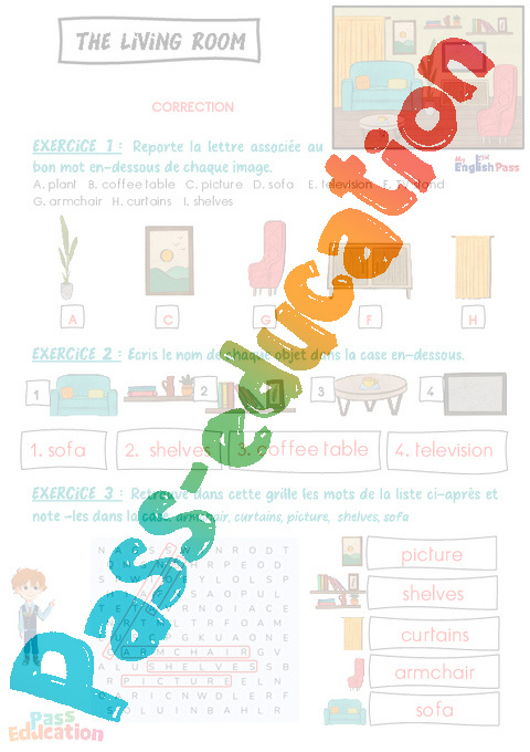 Exercice 3 : Retrouve dans cette grille les mots de la liste ci-après et note -les dans la case. armchair, curtains, picture, plant, shelves, sofa