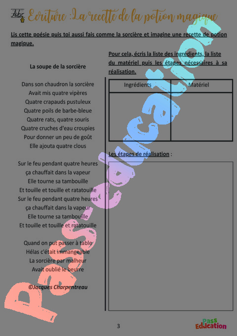 Lis cette poésie puis toi aussi fais comme la sorcière et imagine une recette de potion magique.