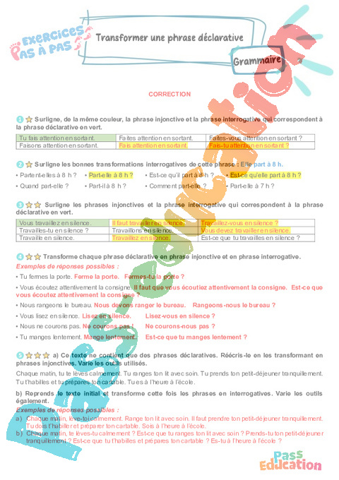 Correction Transformer une phrase déclarative : 5eme Primaire – Exercices Pas à Pas pdf